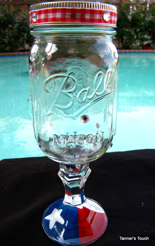 I'm giving away your choices of one pair of Texas Wine Glasses or one pair of Texas Candlesticks. You get to choose which you would prefer and what color beads you like in the stem. The Texas wine glass is a pint Ball jar attached to a glass candlestick. It's about 9" tall and is perfect for your Boone's Farm, ice tea, or wine. The Texas Candlesticks are a half-pint Ball jar attached to a glass candlestick. They come with candles and are about 8" tall. They could also be used for beverages (adult or otherwise). All my glassware is handwash only.